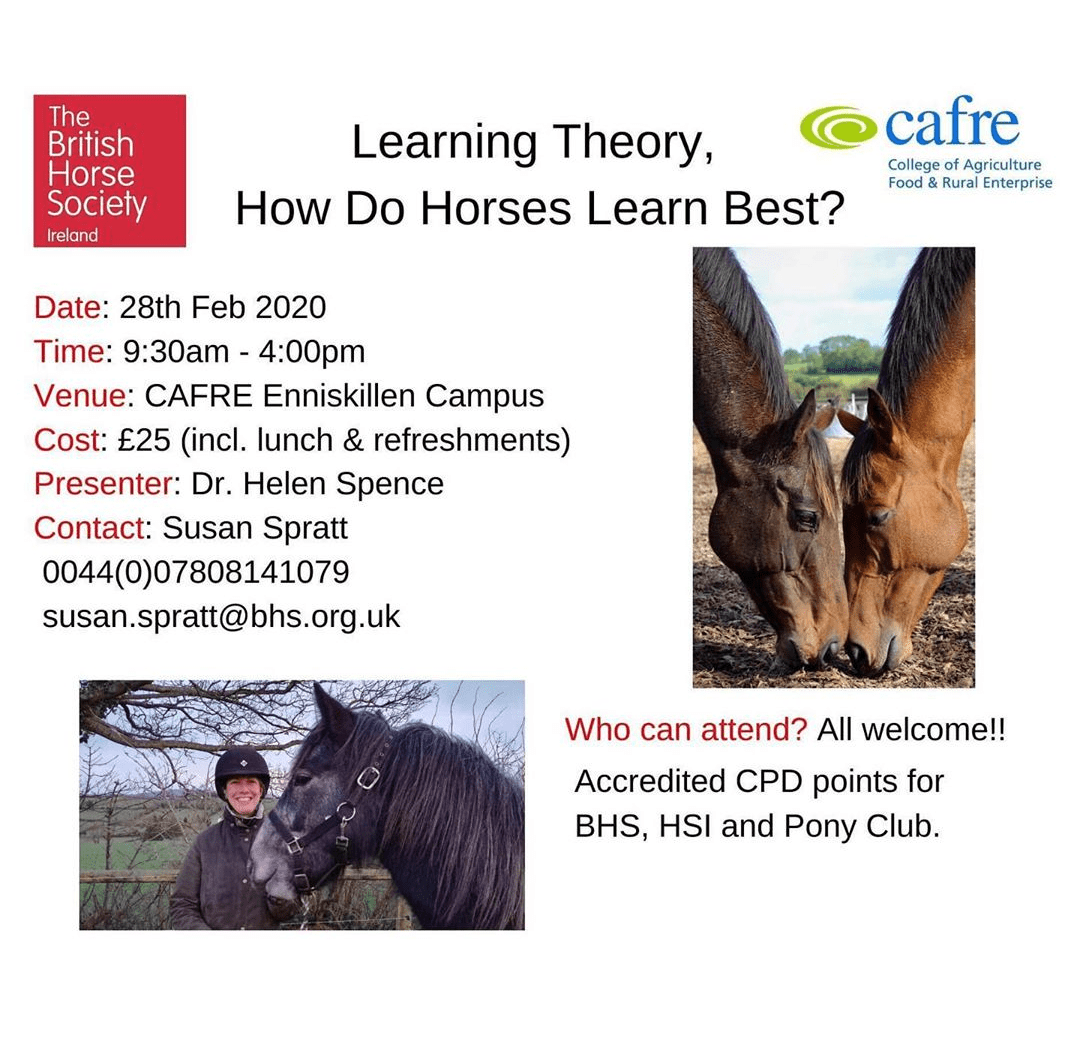 Last year I was delighted to be approached by the British Horse Society, of which I am a long standing member. They asked me to write a chapter on Learning Theory for their latest book, Complete Horsemanship, Volume Four. I took great pleasure in doing my best to explain learning theory in context (rather tricky with a word limit of 9000!). The book was published in December 2019 and this year I am delighted to be delivering Continuing Professional Development training days on the subject, the first of which is happening at Enniskillen College in just a few weeks time.