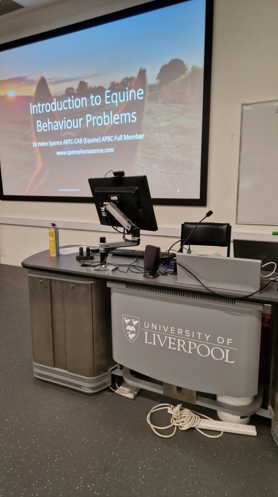 I started back to work on Sunday with a full day of teaching for the vet students at Liverpool Uni. This fantastic opportunity to help veterinary students learn about horse behaviour for vets, recognising body language and signs of stress, pain face, ways of reducing stress in the veterinary practice, cooperative care and case studies comes courtesy of Sarah Heath of BRVP and her fantastic team, along with the generous sponsorship that they organise. I have been doing this for around a decade now, and I absolutely love these days, I feel it makes such a difference. As a Behaviourist I really value the importance of good relationships with veterinary surgeons, working as part of the vet led team leads to vastly improved outcomes for horses and owners, when everyone works together and the communication is good.