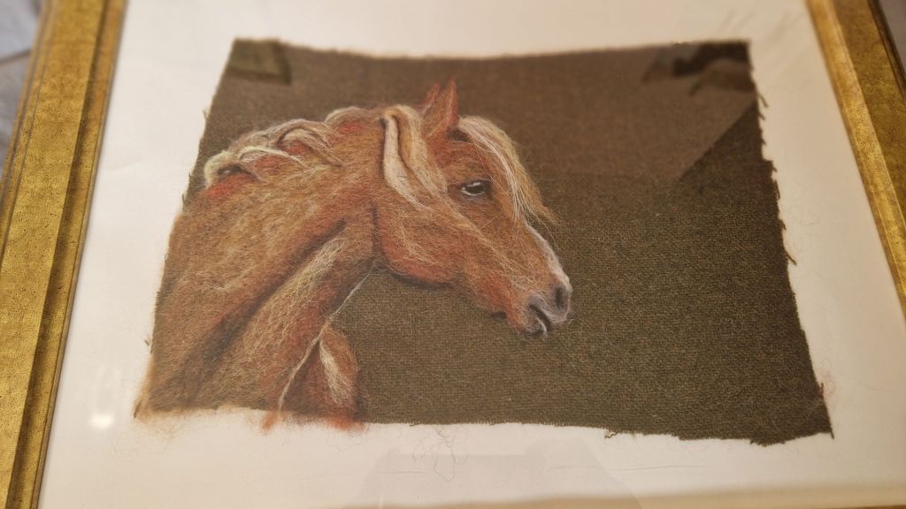 This beautiful needle felt picture made with some of Rosie’s hair in the forelock hangs above my bed, many thanks to my lovely and talented artist friend Sara McComb